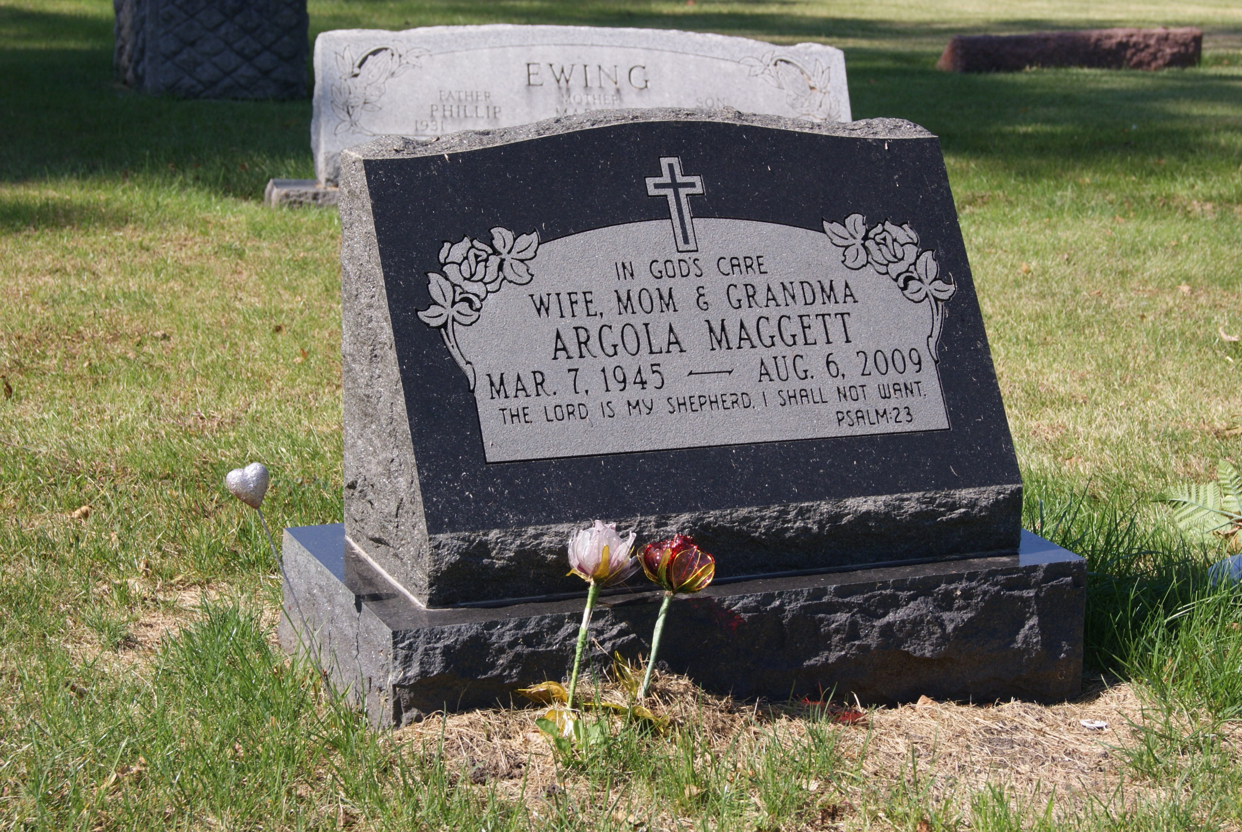 Black granite slant with polished front engraving in panel including cross and roses with leaves