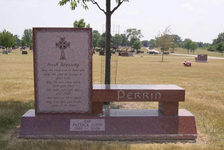 Red granite monument with bench & celtic cross