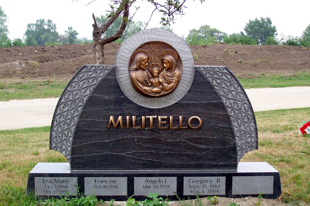Beautiful monument for five graves with bronze holy family appliqué and bronze letters