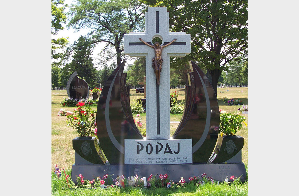 Black and grey granite with cross, bronze corpus of Jesus, hand etched portraits