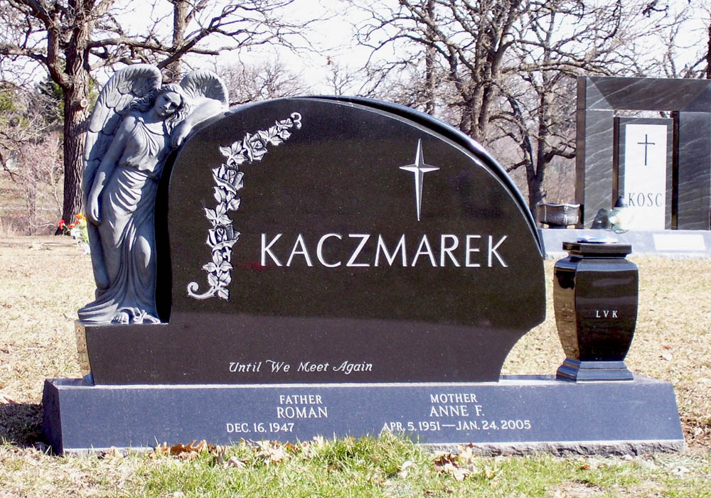 Black granite monument with angel statue and hand carved roses