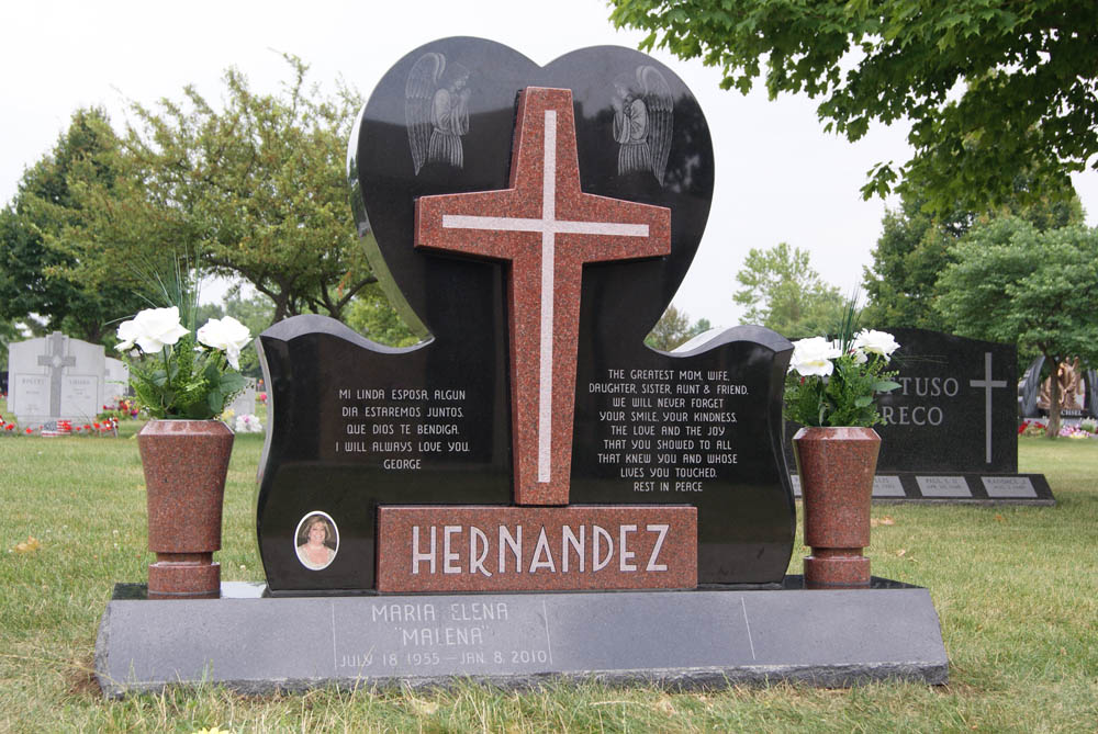 Heart shaped monument with hand etched angels, ceramic photo, verse & vases