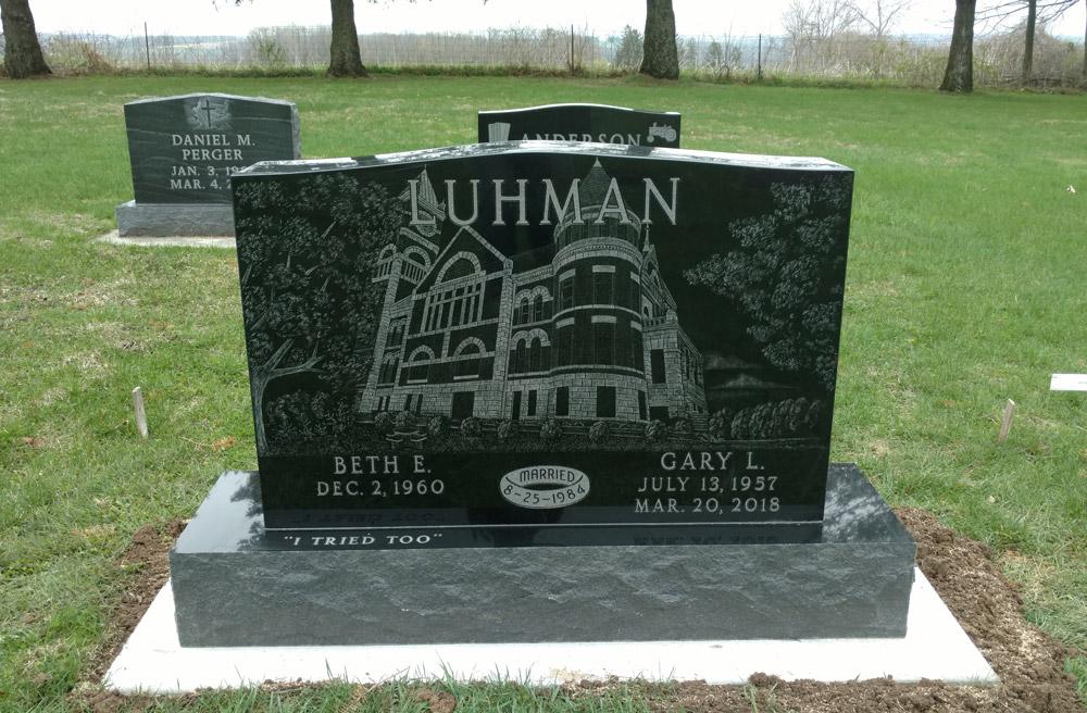 Hand engraved scene on black two grave monument