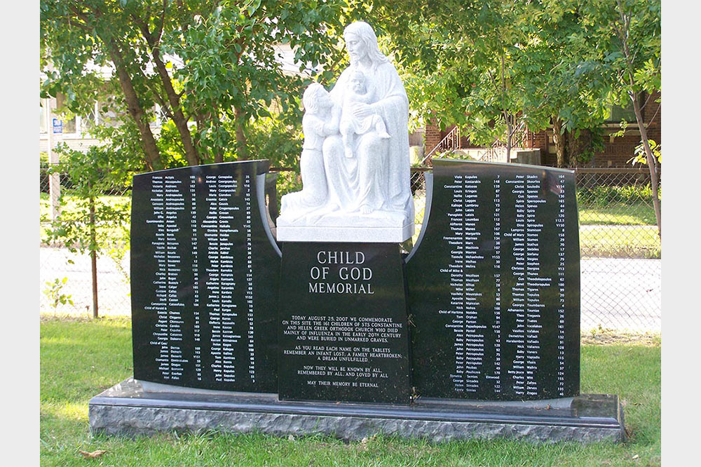 This memorial was commissioned by Saints Constantine and Helen Greek Orthodox Church to honor the 161 children of the parish who died of influenza in the early 20th century. They are buried in unmarked graves at the site where the memorial stands. The sculpture features an image of Jesus holding a baby while comforting its mother.