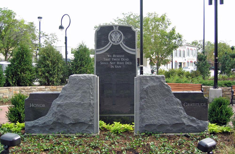 Upright monument and two stone slabs at naperville veterans memorial river walk