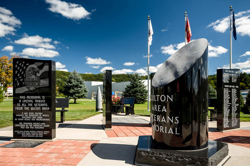 Closeup of black upright cylindrical monument at Wilton WI Veterans Memorial